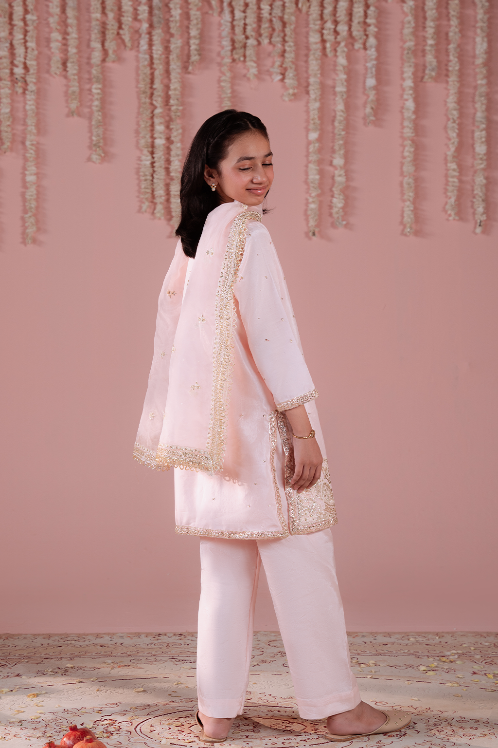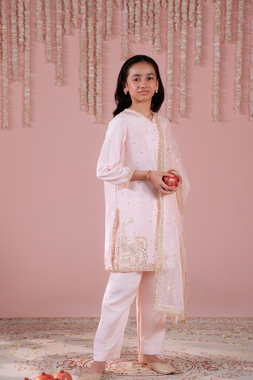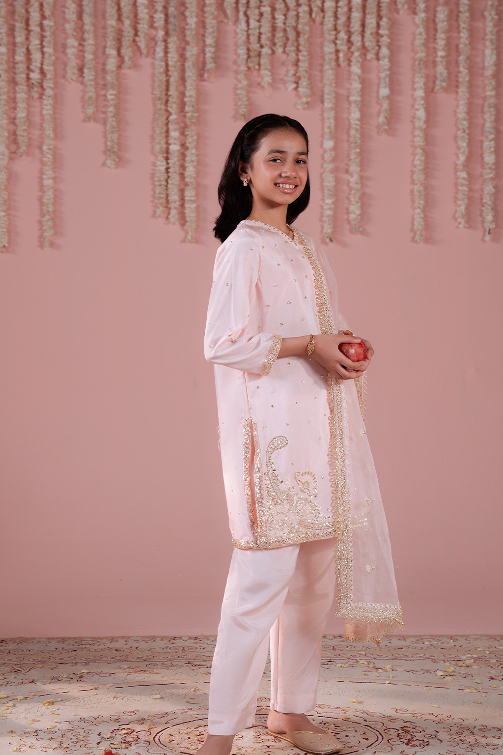Premium Raw Silk Embroidered Shirt. Premium Raw Silk Trouser. Organza Embroidered Dupatta.