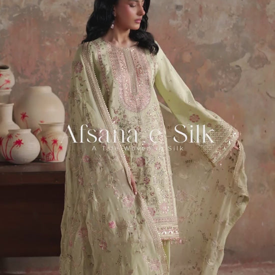 Raw Silk Embroidered Front. Raw Silk Embroidered Sleeves. Raw Silk Fabric For Back. Chiffon Embroidered Dupatta. Raw Silk Embroidered Front And Back Borders. Raw SilkEmbroidered Sleeves Borders. Raw Silk Embroidered Trouser Border. Raw Silk Trouser.