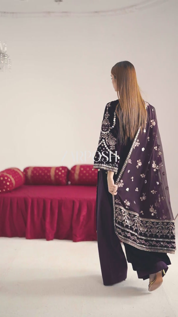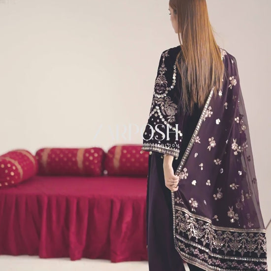 Velvet Embroidered Front Right and Left Body. Velvet Embroidered Front Right and Left Panel. Velvet Embroidered Sleeves. Chiffon Embroidered Dupatta. Velvet Fabric for Back. Velvet Embroidered Sleeves Patches. Velvet Embroidered Dupatta Borders. Raw Silk Trouser.