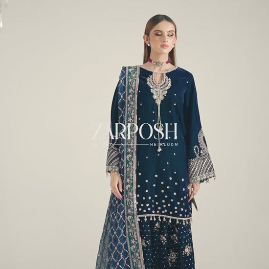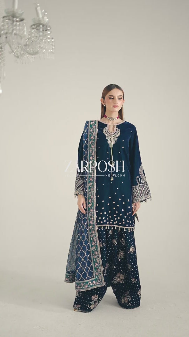 Organza Embroidered Hand Made Neck Line. Velvet Embroidered Front. Velvet Embroidered Sleeves. Velvet Fabric for Back. Chiffon Embroidered Dupatta. Velvet Embroidered Sleeves Border. Velvet Embroidered Trouser. Grip Embroidered Front,Back and Chalk Lace. Grip Embroidered Dupatta Border. Raw Silk Trouser.